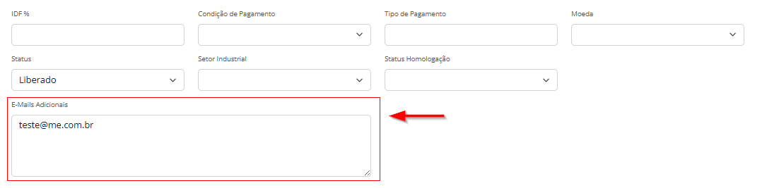 O campo “E-mails Adicionais” permite cadastrar outros contatos do fornecedor que receberão somente notificações, como: